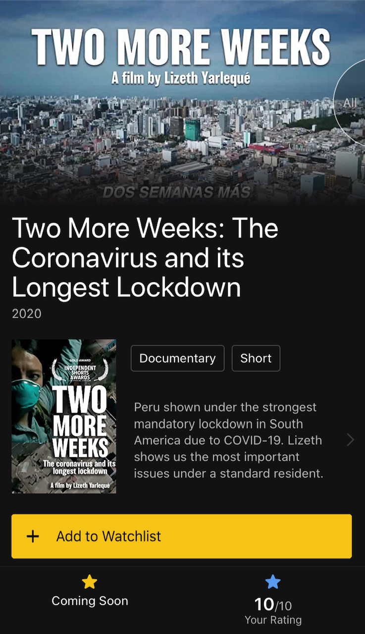 July 2020 / Winner Lizeth’s short documentary ‘Two More weeks’ on the category of Best short Documentary by the Film festival ‘Independent Shorts Awards’ an international festival based in the United States.