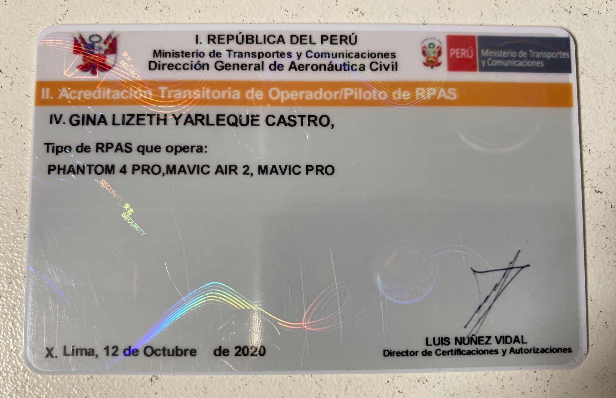 - Drone pilot accreditation given by the Ministry of Transport of Peru
