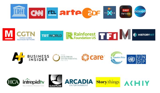 ZDF German channel, ARTE, ORF TV THEK Austrian, RTL Dutch News, Metropolis Dutch channel, TF1 French channel, CNN News, Business Insider, United Nations (UNDP), Rainforest Foundation US, The Goldman Environmental Prize 2021, Storythings UK, Intrepid UK and many more…